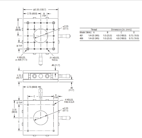尽管是轻型铝制结构,其大型工作区域和三块平行板的坚固设计能对高达 100 磅的负载进行平滑移动。通过弹簧加载的促动器组件可防止出现反冲。此外,这些位移台可按任何方向安装并保证符合规格要求。安装平台具有完整系列的 1/4-20 或 M6 螺纹孔。型号 406 的孔直径为 2.25 英寸 (57.2 mm),与位移台最大对角线位移处的最小值 1.875 英寸 (47.6 mm) 十分接近。