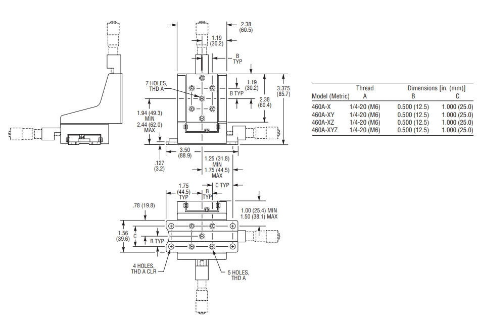 460A-XYZ-LH 0.5英寸(12.7毫米)行程三轴快速安装线性位移台具有集成但模块化的设计,可提高多功能性。Z轴位移台/支架可以由用户拆卸,从而可以将XYZ轴型转换为XY轴型。左手配置的460A-XYZ采用全铝结构,带有硬化的滚珠轴承,沿着相对的成对抛光和硬化的不锈钢棒运行。与我们的交叉滚子轴承平台相比,它提供了出色的位移直线度,但负载能力却更低。平台被弹簧加载抵靠驱动促动器,以实现无间隙运动。垂直驱动组件通过促动器轴而不是弹簧来承载负载,以实现正负载支持。需要三个促动器,并单独订购。