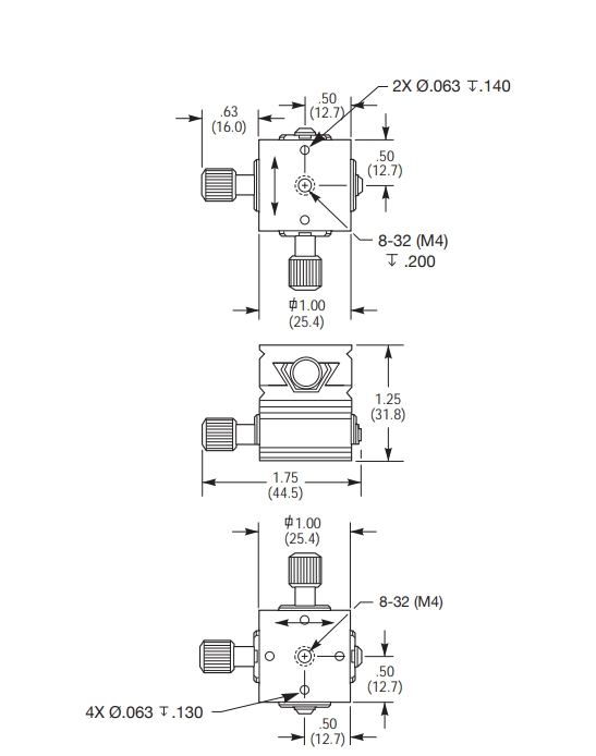 每个位移台都配备一个 80 TPI 的传动螺杆,可进行 1 µm 精确定位。然后可以使用以六角定位螺钉控制的锁定机制将运动锁定在适当位置,确保进行长时间的放置。这些燕尾型位移台虽然尺寸小,但可凭借仅不到 10 磅(最大 43 N)的中心载重能力,位移相当可观的质量。