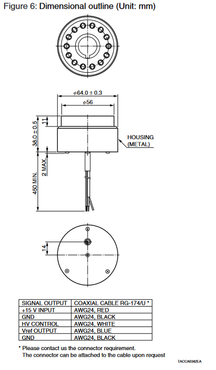 HAMAMATSU滨松 DAP型插座组件 C13002-02 详细参数 类型 高压电源插座组件(DP 型) 适用的 PMT 端窗型 8 级倍增器电极 输入电压 +15 ± 1 V 最大值 输入电压 18 V 最大值 输入电流 65 mA [PMT] 线性直流输出电流最小值 100 μA [PMT] 阳极纹波噪声典型值 0.5 mVp-p [HV Power Supply] 输出电压范围 0 至 -1500 V [HV Power Supply] 建议的输出电压范围 -200 至 -1500 V [HV Power Supply] 针对 ±1 V 输入电荷典型值的线路调节 ±0.01% [HV Power Supply] 输出电压控制 控制电压(0 至 +6 V)或电位器 (50 kΩ) [HV Power Supply] 建议的控制电压范围 +0.8 至 +6 V [HV Power Supply] 控制电压输入阻抗 100 kΩ [HV Power Supply] 温度系数典型值 ±0.01%/°C 工作环境温度 0 至 +45 °C 储存温度 -15 至 +60 °C 重量典型值 122 g 0755 84689265 手机/微信:18320955412 QQ:2423332841 邮箱:2423332841@qq.com...