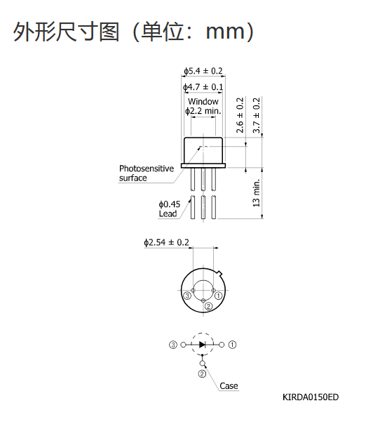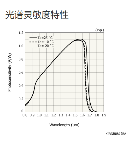 典型值 Tc = 25°C,除非另有说明,感光灵敏度:λ = λp,暗电流:VR = 5 V,截止频率:VR = 5 V,RL = 50 Ω,-3 dB,结电容:VR = 5 V,f = 1 MHz |