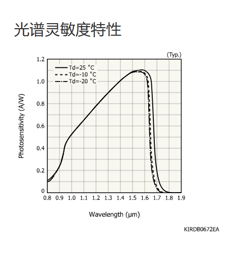 典型值 Tc = -20°C,除非另有说明,感光灵敏度:λ = λp,暗电流:VR = 1 V,截止频率:VR = 1 V,RL = 50 Ω,结电容:VR = 1 V,f = 1 MHz |