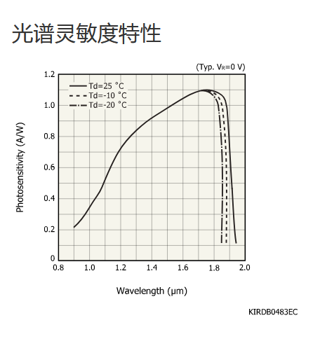 典型值 Tc = -20°C,除非另有说明,感光灵敏度:λ = λp,暗电流:VR = 0.5 V,截止频率:VR = 0 V,RL = 50 Ω,结电容:VR = 0 V,f = 1 MHz |
