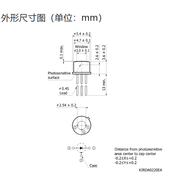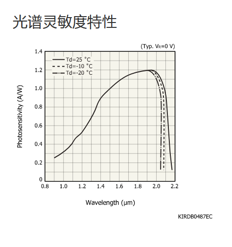 典型值 Tc = 25°C,除非另有说明,感光灵敏度:λ = λp,暗电流:VR = 0.5 V,截止频率:VR = 0 V,RL = 50 Ω,结电容:VR = 0 V,f = 1 MHz |