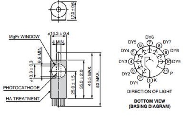 HAMAMATSU滨松 侧面式光电倍增管 R10824 详细参数 类型 侧面式 管子尺寸 13 mm 直径 光阴极面区域形状 正方形 光阴极面区域尺寸 4 x 9.5 mm 波长(短) 115 nm 波长(长) 320 nm 波长(峰值) 200 nm 光谱灵敏度特性曲线代码 250M 光阴极面材料 Cs-Te 窗材 MgF2 倍增器电极结构 圆形罩壳 倍增器电极级数 9 [Max. Rating] 阳极至阴极电压 1250 V [Max. Rating] 平均阳极电流 0.01 mA 阳极至阴极电源电压 1000 V [Cathode] 辐射灵敏度典型值 33(254 nm 时)mA/W [Anode] 辐射灵敏度典型值 2.0 x 105(254 nm 时)A/W [Anode] 增益率典型值 6.0 x 106 [Anode] 暗电流(30 分钟后) 典型值 0.3 nA [Anode] 暗电流(30 分钟后) 最大值 3 nA [Time Response] 上升时间典型值 1.4 ns [Time Response] 渡越时间典型值 15 ns   0755 84689265 手机/微信:18320955412  QQ:2423332841  邮箱:2423332841@qq.com...