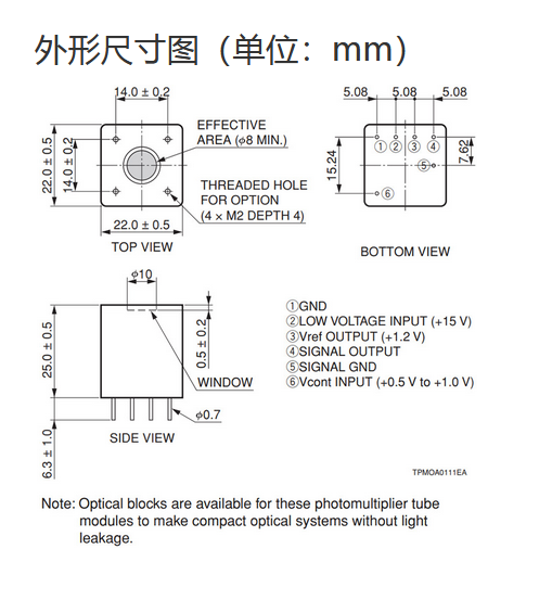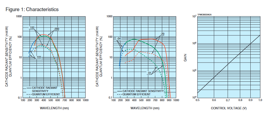 HAMAMATSU滨松 光电倍增管模块 H14950-20 详细参数 光阴极面区域形状 圆形 光阴极面区域尺寸 8 mm 直径 波长(短) 300 nm 波长(长) 920 nm 波长(峰值) 630 nm 尺寸 (W x H x D) 22.0 mm x 22.0 mm x 25.0 mm 输入电压 +11.5 V 至 +15.5 V 最大值 输入电压 18 V 最大值 输入电流 12 mA 最大值 输出信号电流 100 μA 最大值 控制电压 +1.0 V(输入阻抗 30 kΩ) 建议的控制电压调节范围 +0.5 V 至 +1.0 V(输入阻抗 30 kΩ) [阴极] 亮度灵敏度最小值 350 μA/lm [阴极] 亮度灵敏度典型值 500 μA/lm [阴极] 红/白比典型值 0.45 [阴极] 辐射灵敏度典型值 78 mA/W [阳极] 亮度灵敏度最小值 140 A/lm [阳极] 亮度灵敏度典型值 500 A/lm [阳极] 辐射灵敏度典型值 0.8 x 105 A/W [阳极] 暗电流(30 分钟后) 典型值 10 nA [阳极] 暗电流(30 分钟后) 最大值 100 nA [时间响应] 上升时间典型值 0.6 ns 波纹噪声(峰间)最大值 0.6 mV 建立时间最大值 0.2 s 工作环境温度 +5°C 至 +50°C 储存温度...