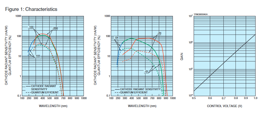 HAMAMATSU滨松 光电倍增管模块 H14950-100 详细参数 光阴极面区域形状 圆形 光阴极面区域尺寸 8 mm 直径 波长(短) 300 nm 波长(长) 650 nm 波长(峰值) 400 nm 尺寸 (W x H x D) 22.0 mm x 22.0 mm x 25.0 mm 输入电压 +11.5 V 至 +15.5 V 最大值 输入电压 18 V 最大值 输入电流 12 mA 最大值 输出信号电流 100 μA 最大值 控制电压 +1.0 V(输入阻抗 30 kΩ) 建议的控制电压调节范围 +0.5 V 至 +1.0 V(输入阻抗 30 kΩ) [阴极] 亮度灵敏度最小值 80 μA/lm [阴极] 亮度灵敏度典型值 105 μA/lm [阴极] 蓝光灵敏度指数典型值 13.5 [阴极] 辐射灵敏度典型值 110 mA/W [阳极] 亮度灵敏度最小值 30 A/lm [阳极] 亮度灵敏度典型值 105 A/lm [阳极] 辐射灵敏度典型值 1.1 x 105 A/W [阳极] 暗电流(30 分钟后) 典型值 0.5 nA [阳极] 暗电流(30 分钟后) 最大值 5 nA [时间响应] 上升时间典型值 0.6 ns 波纹噪声(峰间)最大值 0.6 mV 建立时间最大值 0.2 s 工作环境温度 +5°C 至 +50°C 储...
