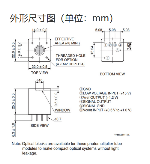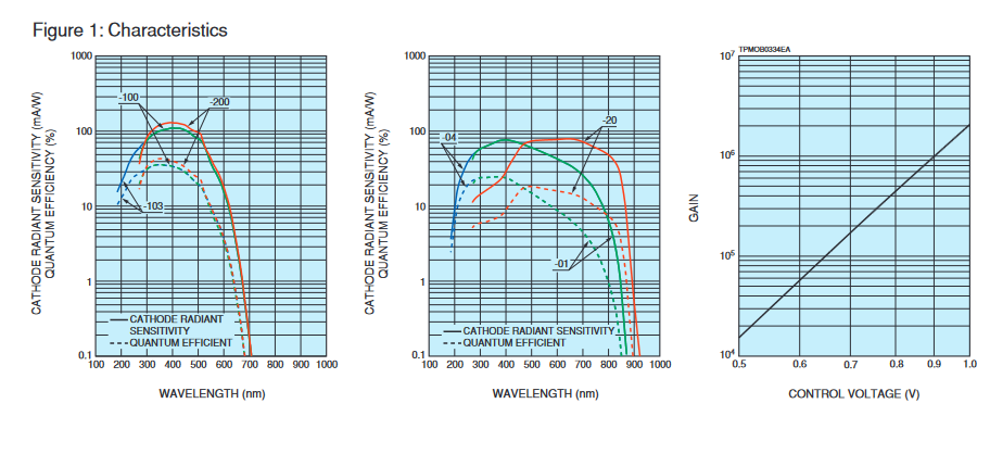 HAMAMATSU滨松 光电倍增管模块 H14950-200 详细参数 光阴极面区域形状 圆形 光阴极面区域尺寸 8 mm 直径 波长(短) 300 nm 波长(长) 650 nm 波长(峰值) 400 nm 尺寸 (W x H x D) 22.0 mm x 22.0 mm x 25.0 mm 输入电压 +11.5 V 至 +15.5 V 最大值 输入电压 18 V 最大值 输入电流 12 mA 最大值 输出信号电流 100 μA 最大值 控制电压 +1.0 V(输入阻抗 30 kΩ) 建议的控制电压调节范围 +0.5 V 至 +1.0 V(输入阻抗 30 kΩ) [阴极] 亮度灵敏度最小值 100 μA/lm [阴极] 亮度灵敏度典型值 135 μA/lm [阴极] 蓝光灵敏度指数典型值 15.5 [阴极] 辐射灵敏度典型值 130 mA/W [阳极] 亮度灵敏度最小值 40 A/lm [阳极] 亮度灵敏度典型值 135 A/lm [阳极] 辐射灵敏度典型值 1.3 x 105 A/W [阳极] 暗电流(30 分钟后) 典型值 0.5 nA [阳极] 暗电流(30 分钟后) 最大值 5 nA [时间响应] 上升时间典型值 0.6 ns 波纹噪声(峰间)最大值 0.6 mV 建立时间最大值 0.2 s 工作环境温度 +5°C 至 +50°C 储...