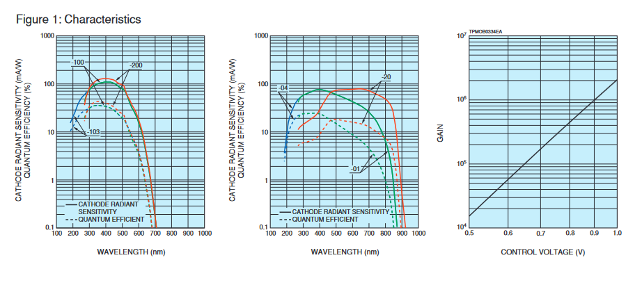 HAMAMATSU滨松 光电倍增管模块 H14951-01 详细参数 光阴极面区域形状 圆形 光阴极面区域尺寸 8 mm 直径 波长(短) 300 nm 波长(长) 870 nm 波长(峰值) 400 nm 尺寸 (W x H x D) 22.0 mm x 22.0 mm x 25.0 mm 输入电压 +11.5 V 至 +15.5 V 最大值 输入电压 18 V 最大值 输入电流 12 mA 最大值 输出信号电流 100 μA 最大值 控制电压 +1.0 V(输入阻抗 30 kΩ) 建议的控制电压调节范围 +0.5 V 至 +1.0 V(输入阻抗 30 kΩ) [阴极] 亮度灵敏度最小值 100 μA/lm [阴极] 亮度灵敏度典型值 200 μA/lm [阴极] 红/白比典型值 0.25 [阴极] 辐射灵敏度典型值 77 mA/W [阳极] 亮度灵敏度最小值 40 A/lm [阳极] 亮度灵敏度典型值 200 A/lm [阳极] 辐射灵敏度典型值 0.8 x 105 A/W [阳极] 暗电流(30 分钟后) 典型值 1 nA [阳极] 暗电流(30 分钟后) 最大值 10 nA [时间响应] 上升时间典型值 0.6 ns 波纹噪声(峰间)最大值 0.6 mV 建立时间最大值 0.2 s 工作环境温度 +5°C 至 +50°C 储存温度 -2...