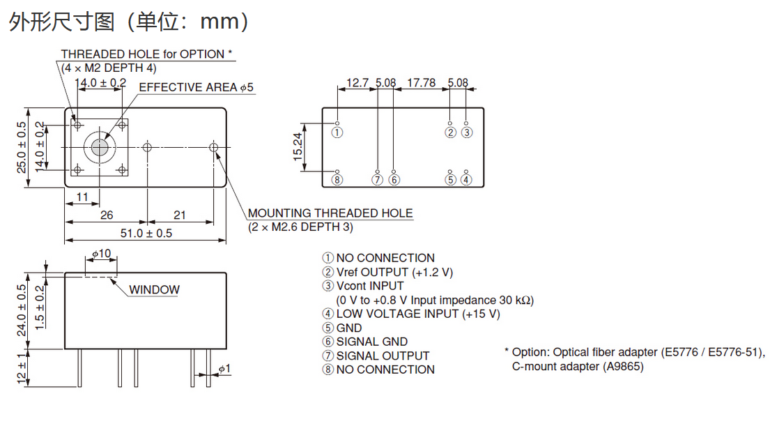 HAMAMATSU滨松 光电倍增管模块 H16200-42 详细参数 参数 说明/值 单位 输入电压 +11.5 至 +15.5 V 最大输入电压 +18 V 最大输入电流 *1 12 mA 最大输出信号电流 40 μA 最大控制电压 *2 +0.9(输入阻抗 30 kΩ) V 建议的控制电压调节范围 *2 +0.5 至 +0.8 V 有效面积 直径 5 mm 光谱灵敏度特性 300 至 840 nm 峰值量子效率波长 660 nm [阴极] 量子效率 处于峰值量子效率波长时 最小 15 % 典型值 25 % [阴极] 辐射灵敏度 处于峰值量子效率波长时 最小 80 mA/W 典型值 133 mA/W [阳极] 辐射灵敏度 处于峰值量子效率波长时 最小 4.8 × 104 A/W 典型值 1.3 × 105 A/W [阳极] 暗电流 *3 *4 典型值 3 nA 最大值 11 nA [阳极] 增益率 *3 典型值 1.0 × 106 - 上升时间 *3 典型值 1.0 ns 波纹噪声(峰间)*3 *5 最大值 0.6 mV 建立时间 *6 最大值 0.2 s 工作环境温度 *7 +5 至 +35 °C 储存温度 *7 -20 至 +50 °C 重量 76 g 0755 84689265 手机/微信:18320955412 &nbs...
