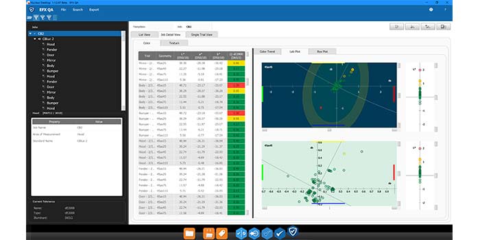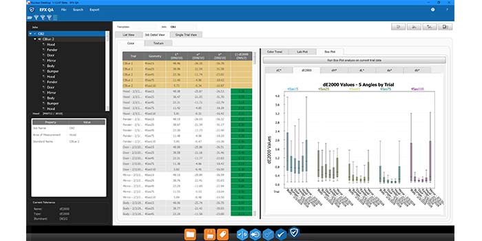 EFX QC软件可以设置全局容差和测量点位顺序,并进行数字化沟通。通过将其与爱色丽 MA-5 QC 、MA-T6 或 MA-T12 多角度分光光度仪配套使用,质量控制专业人士可以轻松定义、沟通和确保分布于整个供应链的色彩、闪烁度、颗粒度符合标准和测试流程。