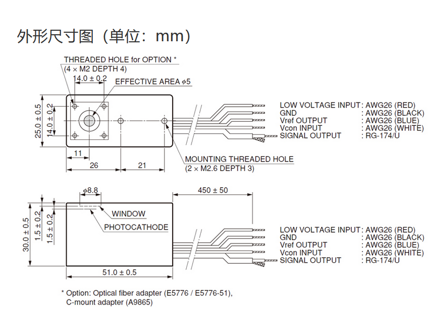 HAMAMATSU滨松 光电倍增管模块 H16204P-50 详细参数 参数 说明/值 单位 输入电压 +11.5 至 +15.5 V 最大输入电压 +18 V 最大输入电流 *1 12 mA 最大输出信号电流 40 μA 最大控制电压 *2 +0.9(输入阻抗 30 kΩ) V 建议的控制电压调节范围 *2 +0.5 至 +0.8 V 有效面积 直径 5 mm 光谱灵敏度特性 380 至 900 nm 峰值量子效率波长 630 nm [阴极] 量子效率 处于峰值量子效率波长时 最小 14 % 典型值 19 % [阴极] 辐射灵敏度 处于峰值量子效率波长时 最小 70 mA/W 典型值 95 mA/W [阳极] 辐射灵敏度 处于峰值量子效率波长时 最小 4.2 × 104 A/W 典型值 9.5 × 104 A/W [阳极] 暗计数(P 型)*4 *5 典型值 7500 s-1 最大值 22 500  [阳极]  增益率 *3 典型值 2.0 × 106 - 上升时间 *3 典型值 1.0 ns 波纹噪声(峰间)*3 *6 最大值 0.6 mV 建立时间 *7 最大值 0.2 s 工作环境温度 *8 +5 至 +35 °C 储存温度 *8 -20 至 +50 °C 重量 106 g 0755 84689265 手机/微信:1832095541...