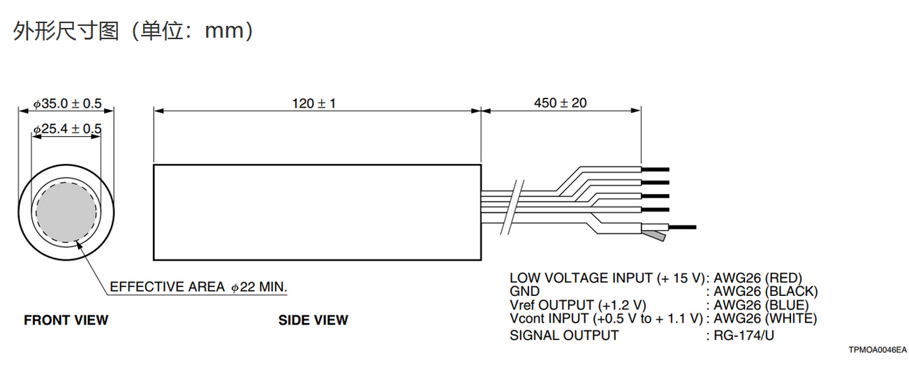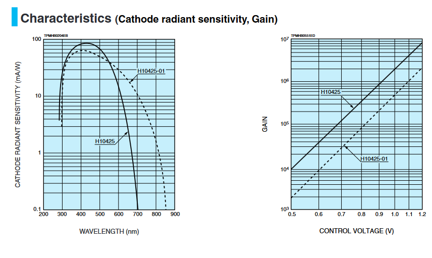 HAMAMATSU滨松 光电倍增管模块 H10425-01 详细参数 光阴极面区域形状 圆形 光阴极面区域尺寸 22 mm 直径 波长(短) 300 nm 波长(长) 850 nm 波长(峰值) 420 nm 尺寸 (W x H x D) 直径 35.0 x 120.0 mm 输入电压 +11.5 至 +15.5 V 最大值 输入电压 18 V 最大值 输入电流 3 mA 最大值 输出信号电流 100 μA 最大值 控制电压 1.2 V 建议的控制电压调节范围 +0.5 至 +1.1 V [Cathode] 亮度灵敏度最小值 80 μA/lm [Cathode] 亮度灵敏度典型值 150 μA/lm [Cathode] 红白比典型值 0.2 [Cathode] 辐射灵敏度典型值 64 mA/W [Anode] 亮度灵敏度最小值 20 A/lm [Anode] 亮度灵敏度典型值 75 A/lm [Anode] 辐射灵敏度典型值 3.2 x 104 A/W [Anode] 暗电流(30 分钟后) 典型值 3 nA [Anode] 暗电流(30 分钟后) 最大值 20 nA [Time Response] 上升时间典型值 1.5 ns 波纹噪声(峰间)最大值 0.5 mV 建立时间最大值 10 s 工作环境温度 +5 至 +50 °C 储存温度 -20 至 +50 °C 重量 180 g   0755 84...