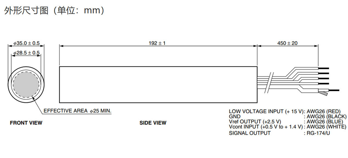 HAMAMATSU滨松 光电倍增管模块 H10426-01 详细参数 光阴极面区域形状 圆形 光阴极面区域尺寸 25 mm 直径 波长(短) 185 nm 波长(长) 850 nm 波长(峰值) 420 nm 尺寸 (W x H x D) 直径 35.0 x 192.0 mm 输入电压 +11.5 至 +15.5 V 最大值 输入电压 18 V 最大值 输入电流 3 mA 最大值 输出信号电流 100 μA 最大值 控制电压 1.5 V 建议的控制电压调节范围 +0.5 至 +1.4 V [Cathode] 亮度灵敏度最小值 80 μA/lm [Cathode] 亮度灵敏度典型值 150 μA/lm [Cathode] 红白比典型值 0.2 [Cathode] 辐射灵敏度典型值 64 mA/W [Anode] 亮度灵敏度最小值 20 A/lm [Anode] 亮度灵敏度典型值 80 A/lm [Anode] 辐射灵敏度典型值 3.4 x 104 A/W [Anode] 暗电流(30 分钟后) 典型值 3 nA [Anode] 暗电流(30 分钟后) 最大值 15 nA [Time Response] 上升时间典型值 15 ns 波纹噪声(峰间)最大值 0.5 mV 建立时间最大值 10 s 工作环境温度 +5 至 +50 °C 储存温度 -20 至 +50 °C 重量 270 g 0755 84689265 手...