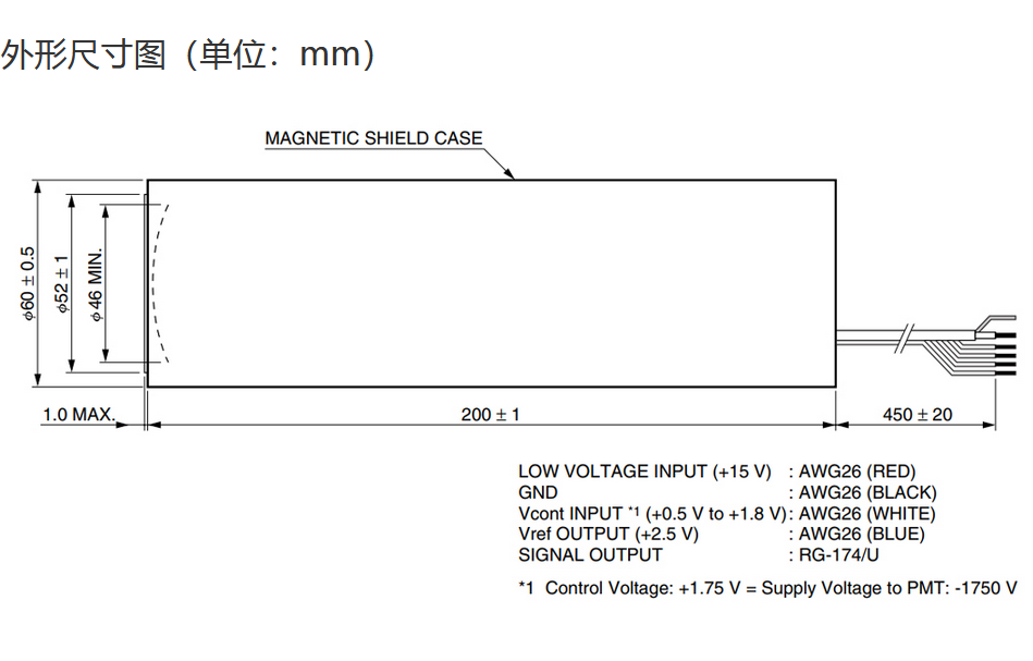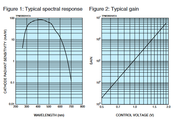 HAMAMATSU滨松 光电倍增管模块 H11411 详细参数 光阴极面区域形状 圆形 光阴极面区域尺寸 46 mm 直径 波长(短) 300 nm 波长(长) 650 nm 波长(峰值) 420 nm 尺寸 (W x H x D) 直径 60 x 200 mm 输入电压 +11.5 至 +15.5 V 最大值 输入电压 18 V 最大值 输入电流 5 mA 最大值 输出信号电流 200 μA 最大值 控制电压 1.9 V 建议的控制电压调节范围 +0.5 至 +1.8 V [Cathode] 亮度灵敏度最小值 60 μA/lm [Cathode] 亮度灵敏度典型值 90 μA/lm [Cathode] 蓝敏度指数 (CS 5-58) 典型值 10.5 [Cathode] 辐射灵敏度典型值 85 mA/W [Anode] 亮度灵敏度最小值 30 A/lm [Anode] 亮度灵敏度典型值 300 A/lm [Anode] 辐射灵敏度典型值 2.8 x 105 A/W [Anode] 暗电流(30 分钟后) 典型值 6 nA [Anode] 暗电流(30 分钟后) 最大值 40 nA [Time Response] 上升时间典型值 2 ns 波纹噪声(峰间)最大值 1 mV 建立时间最大值 10 s 工作环境温度 +5 至 +50 °C 储存温度 -20 至 +50 °C 重量 560 g 0755 84...