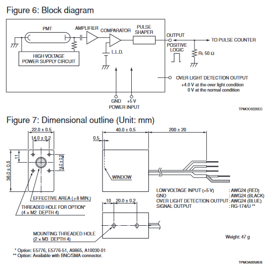 HAMAMATSU滨松 光电倍增管模块 H10682-110 详细参数 光阴极面区域形状 圆形 光阴极面区域尺寸 8 mm 直径 波长(短) 230 nm 波长(长) 700 nm 波长(峰值) 400 nm 尺寸 (W x H x D) 22.0 x 36.0 x 40.0 mm 输入电压 +4.75 至 +5.25 V 最大值 输入电压 6 V 最大值 输入电流 40 mA 300 nm 处的计数灵敏度典型值 3.7 x 105 s-1・pW-1 400 nm 处的计数灵敏度典型值 4.9 x 105 s-1・pW-1 500 nm 处的计数灵敏度典型值 3.7 x 105 s-1・pW-1 600 nm 处的计数灵敏度典型值 1.1 x 105 s-1・pW-1 700 nm 处的计数灵敏度典型值 7.7 x 103 s-1・pW-1 计数线性度 5.0 x 106 s-1 暗计数典型值 50 s-1 暗计数最大值 100 s-1 脉冲对分辨率 20 ns 输出脉冲宽度 10 ns 输出脉冲高度最小值 2 V 输出脉冲高度典型值 2.2 V 建议的负载电阻 50 Ω 信号输出逻辑 正逻辑 工作环境温度 +5 至 +40 °C 储存温度 -20 至 +50 °C 重量 47 g   0755 84689265 手机/微信:18320955412  QQ:2423332841  ...