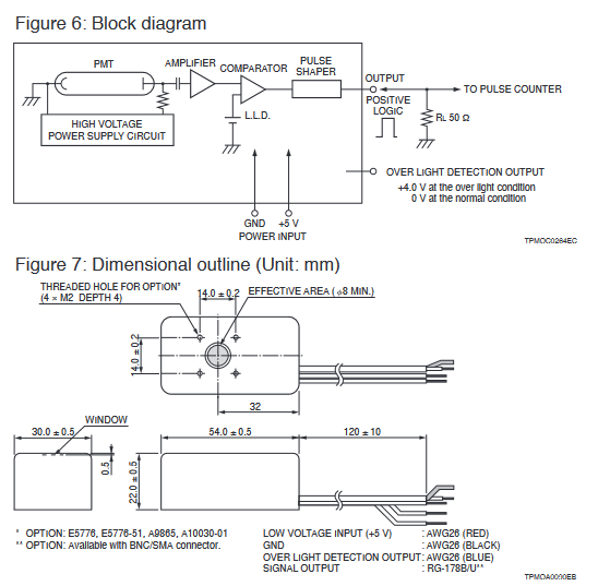 HAMAMATSU滨松 光电倍增管模块 H12386-210 详细参数 光阴极面区域形状 圆形 光阴极面区域尺寸 8 mm 直径 波长(短) 230 nm 波长(长) 700 nm 波长(峰值) 400 nm 尺寸 (W x H x D) 30.0 mm x 22.0 mm x 54.0 mm 输入电压 +4.75 V 至 +5.25 V 最大值 输入电压 6 V 最大值 输入电流 40 mA 300 nm 处的计数灵敏度典型值 3.9 x 105 s-1・pW-1 400 nm 处的计数灵敏度典型值 6.1 x 105 s-1・pW-1 500 nm 处的计数灵敏度典型值 4.6 x 105 s-1・pW-1 600 nm 处的计数灵敏度典型值 1.3 x 105 s-1・pW-1 700 nm 处的计数灵敏度典型值 9.1 x 103 s-1・pW-1 计数线性度 5.0 x 106 s-1 暗计数典型值 50 s-1 暗计数最大值 100 s-1 脉冲对分辨率 20 ns 输出脉冲宽度 10 ns 输出脉冲高度最小值 2 V 输出脉冲高度典型值 2.2 V 建议的负载电阻 50 Ω 信号输出逻辑 正逻辑 工作环境温度 +5°C 至 +40°C 储存温度 -20°C 至 +50°C 重量 61 g 0755 84689265 手机/微信:18320955412 QQ:242...
