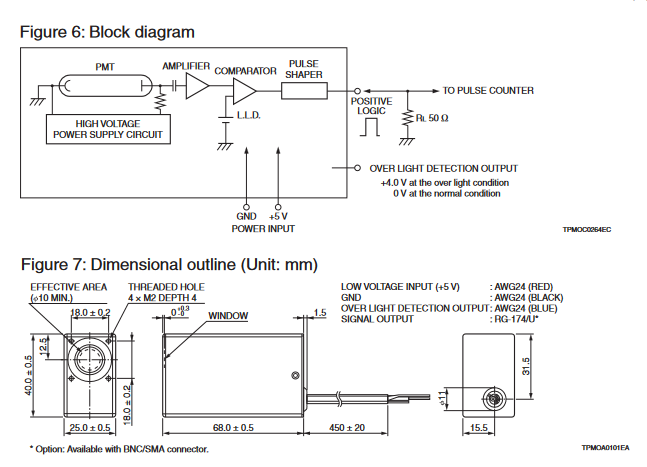 HAMAMATSU滨松 光电倍增管模块 H12775 详细参数 光阴极面区域形状 圆形 光阴极面区域尺寸 10 mm 直径 波长(短) 300 nm 波长(长) 650 nm 波长(峰值) 420 nm 尺寸 (W x H x D) 25.0 x 40.0 x 68.0 mm 输入电压 +4.75 至 +5.25 V 最大值 输入电压 6 V 最大值 输入电流 40 mA 300 nm 处的计数灵敏度典型值 2.5 x 105 s-1・pW-1 400 nm 处的计数灵敏度典型值 4.4 x 105 s-1・pW-1 500 nm 处的计数灵敏度典型值 3.6 x 105 s-1・pW-1 600 nm 处的计数灵敏度典型值 1.2 x 105 s-1・pW-1 计数线性度 5.0 x 106 s-1 暗计数典型值 30 s-1 暗计数最大值 100 s-1 脉冲对分辨率 20 ns 输出脉冲宽度 10 ns 输出脉冲高度最小值 +2.0(负载电阻 50Ω)+4.0(未端接)V 输出脉冲高度典型值 +2.2(负载电阻 50Ω)+4.4(未端接)V 建议的负载电阻 50 Ω 信号输出逻辑 正逻辑 工作环境温度 +5 至 +40 °C 储存温度 -20 至 +50 °C 重量 79 g 0755 84689265 手机/微信:18320955412 QQ:24233...