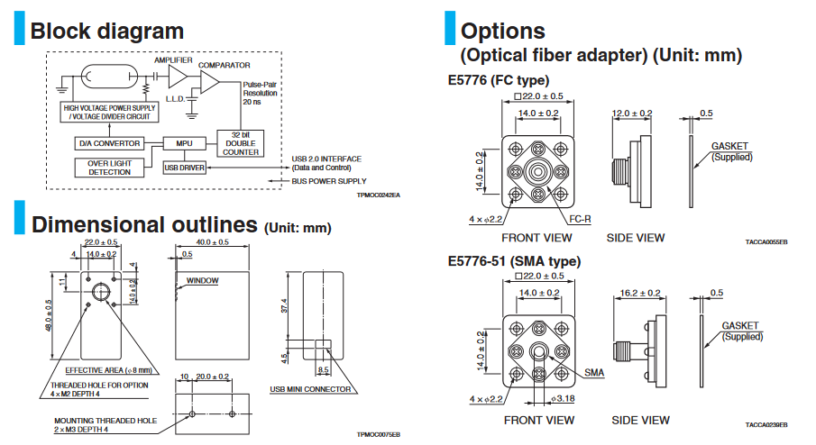 HAMAMATSU滨松 光电倍增管模块 H11890-110 详细参数 光阴极面区域形状 圆形 光阴极面区域尺寸 8 mm 直径 波长(短) 230 nm 波长(长) 700 nm 波长(峰值) 400 nm 尺寸 (W x H x D) 22.0 x 40.0 x 48.0 mm 输入电压 USB 总线供电 V 最大值 输入电压 6 V 最大值 输入电流 50 mA 300 nm 处的计数灵敏度典型值 3.7 x 105 s-1・pW-1 400 nm 处的计数灵敏度典型值 4.9 x 105 s-1・pW-1 500 nm 处的计数灵敏度典型值 3.7 x 105 s-1・pW-1 600 nm 处的计数灵敏度典型值 1.1 x 105 s-1・pW-1 700 nm 处的计数灵敏度典型值 7.7 x 103 s-1・pW-1 计数线性度 5.0 x 106 s-1 暗计数典型值 50 s-1 暗计数最大值 100 s-1 脉冲对分辨率 20 ns 工作环境温度 +5 至 +40 °C 储存温度 -20 至 +50 °C 重量 54 g 0755 84689265 手机/微信:18320955412 QQ:2423332841 邮箱:2423332841@qq.com ...