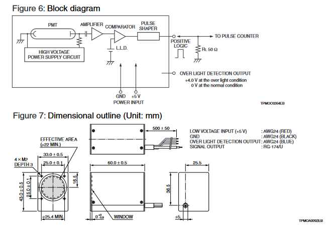 HAMAMATSU滨松 光电倍增管模块 H13467-02 详细参数 光阴极面区域形状 圆形 光阴极面区域尺寸 22 mm 直径 波长(短) 300 nm 波长(长) 650 nm 波长(峰值) 420 nm 尺寸 (W x H x D) 33.0 x 43.0 x 60.0 mm 输入电压 +4.75 至 +5.25 V 最大值 输入电压 6 V 最大值 输入电流 100 mA 300 nm 处的计数灵敏度典型值 2.3 x 105 s-1・pW-1 400 nm 处的计数灵敏度典型值 4.1 x 105 s-1・pW-1 500 nm 处的计数灵敏度典型值 3.4 x 105 s-1・pW-1 600 nm 处的计数灵敏度典型值 5.7 x 104 s-1・pW-1 计数线性度 6.0 x 106 s-1 暗计数典型值 60 s-1 暗计数最大值 300 s-1 脉冲对分辨率 18 ns 输出脉冲宽度 9 ns 输出脉冲高度最小值 +2.0(50Ω 负载)+4.0(未端接)V 建议的负载电阻 50 Ω 信号输出逻辑 正逻辑 工作环境温度 +5 至 +40 °C 储存温度 -20 至 +50 °C 重量 111 g 0755 84689265 手机/微信:18320955412 QQ:2423332841 邮箱:2423332841@qq.com...