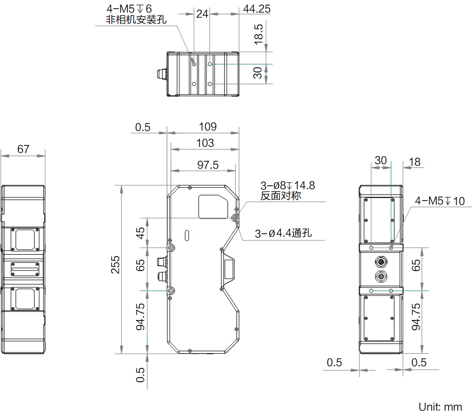 19 mm@远端轮廓数据间隔 5.2 ~ 5.9 μm 扫描帧率 1.3k Hz(最大测量范围下),最高可达19k Hz(ROI模式下) 数据输出类型 轮廓数据、深度图、亮度图、线宽图 触发模式 软触发、硬触发(差分编码器触发) 激光波长 405 nm 激光安全等级 Class3R Z轴分辨率 0.86 ~ 1.14 μm Z轴重复精度 0.27 μm@传感器在光学平台上测试标准量块的数据1 Z轴线性度(±% of MR) 0.01 电气特性 数据接口 Gigabit Ethernet(1000Mbit/s),兼容Fast Ethernet(100Mbit/s) 数字I/O 12-pin M12接口提供供电和I/O,3路差分信号输入(Line 0/3/6),1路差分信号输出(Line 1),1路RS-232 供电 24 VDC 典型功耗 21 W@24 VDC 结构 外形尺寸 255 mm × 109 mm × 67 mm 重量 约2150 g IP防护等级 IP67 温度 工作温度0 ~ 45°C,储藏温度-30 ~ 80°C 湿度 20%~85%RH无凝结 一般规范 软件 3DMVS、VM3D及其它第三方3D软件 操作系统 Windows 7/10 32/64bits、Windows 11 64bits(推荐:i5处理器、8G内存及以上)