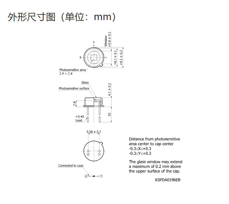 Ta = 25°C,典型值,感光灵敏度:λ = 780 nm,暗电流:VR = 20 V,截止频率:VR = 20 V,结电容:VR = 20 V,f = 1 MHz,噪声等效功率:VR = 20 V,λ = λp,除非另有说明  |