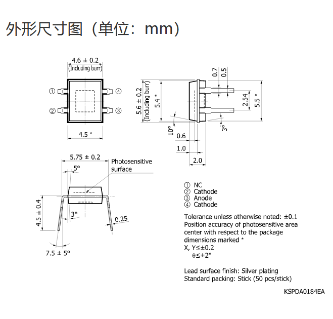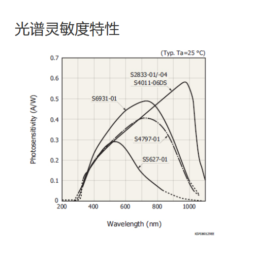 典型值 Ta=25°C,感光灵敏度:λ = λp,暗电流:VR = 1 V,结电容:VR = 0 V,f = 10 kHz,除非另有说明 |