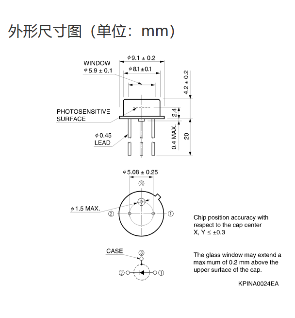 Ta = 25°C,典型值,感光灵敏度:λ = 780 nm,暗电流:VR = 24 V,截止频率:VR = 24 V,结电容:VR = 24 V,f = 1 MHz,λ = λp,噪声等效功率:VR = 24 V,λ = λp,除非另有说明 |