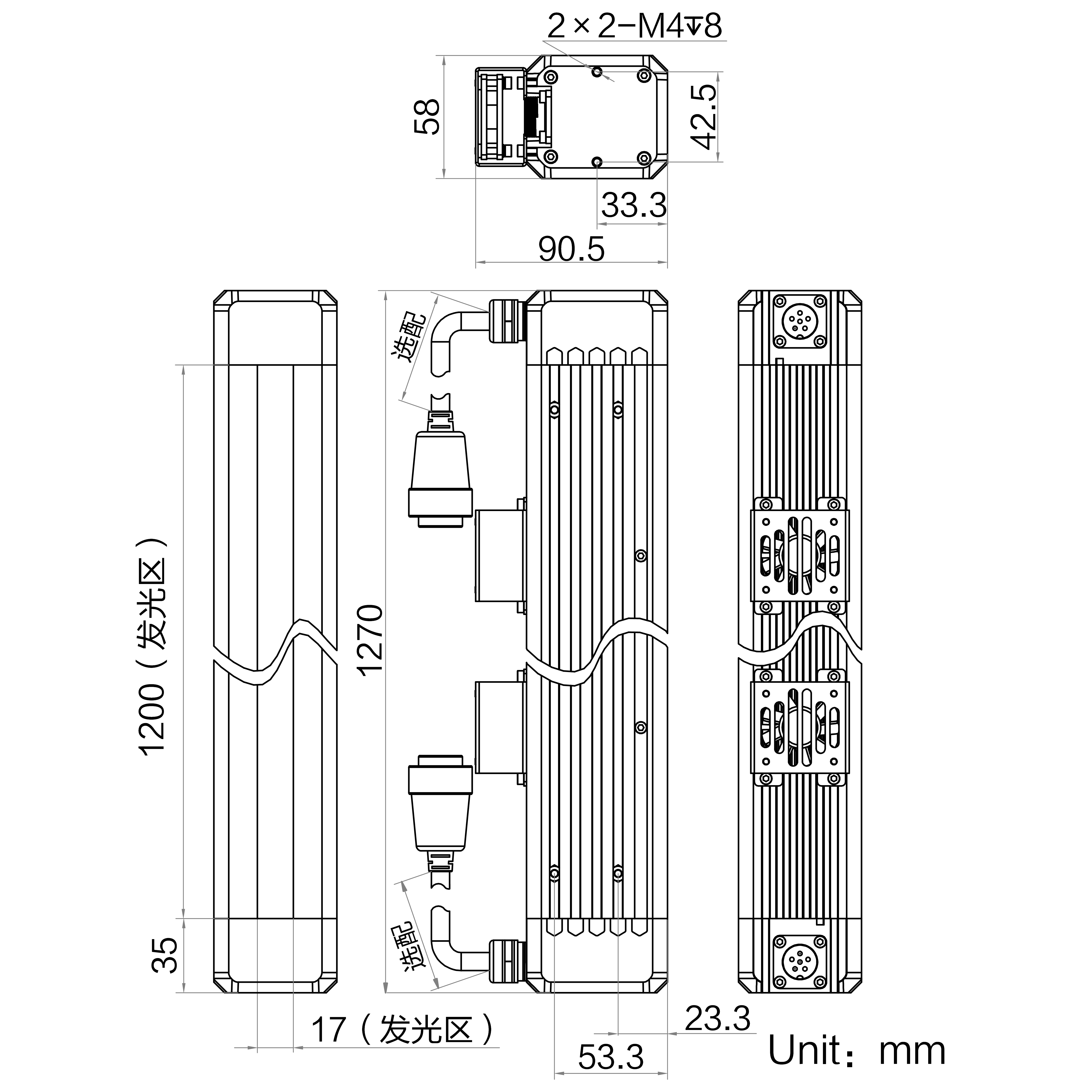 多面螺母槽,安装灵活 型号 型号 MV-LTDS-H-1200-W 名称 MV-LTDS-H-1200-W 性能 颜色 白色 最佳工作距离 10 ~ 200 mm 色温 6000 ~ 7000K 中心照度 ≥100W Lux@WD=50 mm 电气特性 功率 504 W 接口类型 Dual-channel 19M-8H 结构 外形尺寸 1270 mm × 58 mm × 90.5 mm 发光区尺寸 1200 mm × 17 mm 灯珠排数 1 重量 6.73 kg 供电线长度 额外选配 温度 工作温度0~40°C,储藏温度-20~60°C 湿度 20~90%RH无冷凝