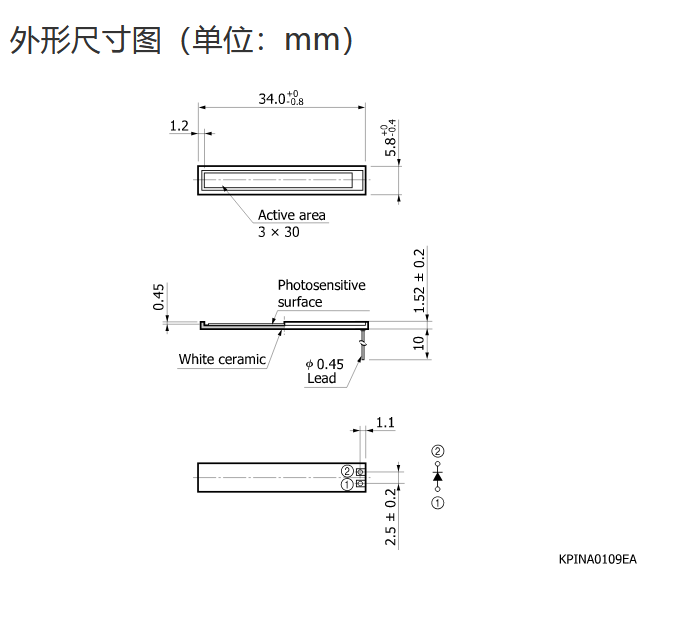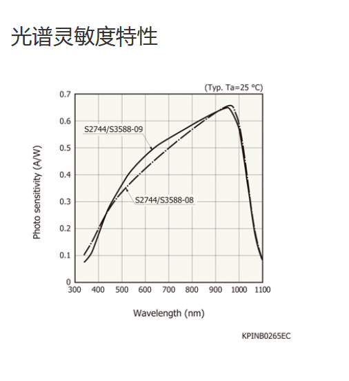 Ta = 25°C,典型值,感光灵敏度:λ = λp,暗电流:VR = 70 V,截止频率:VR = 70 V,结电容:VR = 70 V,f = 1 MHz,噪声等效功率:VR = 70 V,除非另有说明 |
