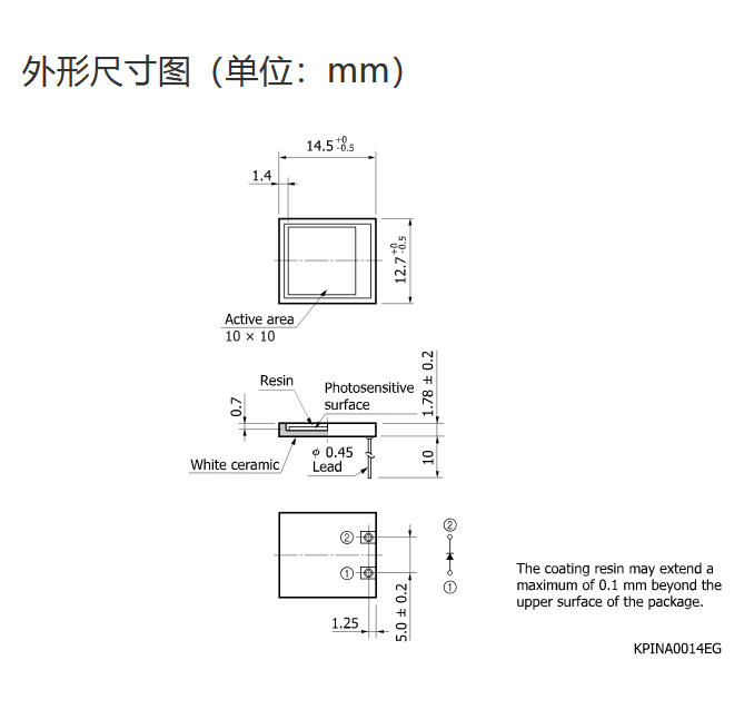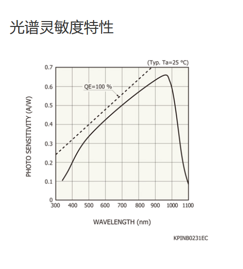 Ta = 25°C,典型值,感光灵敏度:λ = λp,暗电流:VR = 70 V,截止频率:VR = 70 V,结电容:VR = 70 V,f = 1 MHz,噪声等效功率:VR = 70 V,除非另有说明 |