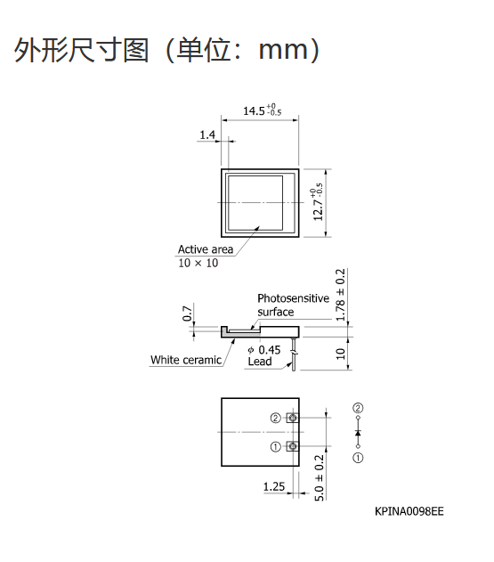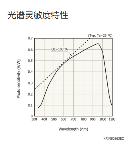 Ta = 25°C,典型值,感光灵敏度:λ = λp,暗电流:VR = 70 V,截止频率:VR = 70 V,结电容:VR = 70 V,f = 1 MHz,噪声等效功率:VR = 70 V,除非另有说明 |