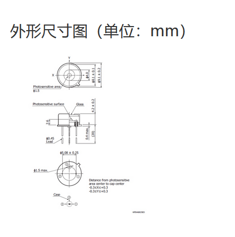 Ta = 25°C,典型值,感光灵敏度:λ = 780 nm,暗电流:VR = 20 V,截止频率:VR = 20 V,结电容:VR = 20 V,f = 1 MHz,λ = λp,噪声等效功率:VR = 20 V,λ = λp,除非另有说明 |