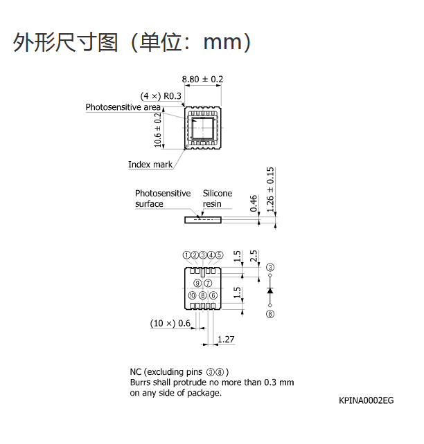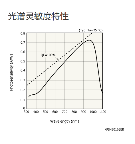 Ta = 25°C,典型值,感光灵敏度:λ = λp,暗电流:VR = 10 V,截止频率:VR = 10 V,结电容:VR = 10 V,f = 1 MHz,噪声等效功率:VR = 10 V,λ = λp,除非另有说明 |