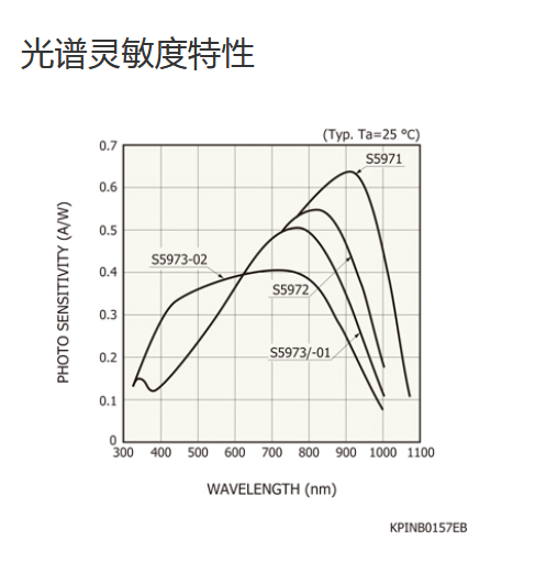 典型值 Ta=25°C,感光灵敏度:λ = 780 nm,暗电流:VR = 10 V,截止频率:VR = 10 V,结电容:VR = 10 V,f = 1 MHz,噪声等效功率:VR = 10 V,λ = λp,除非另有说明 |