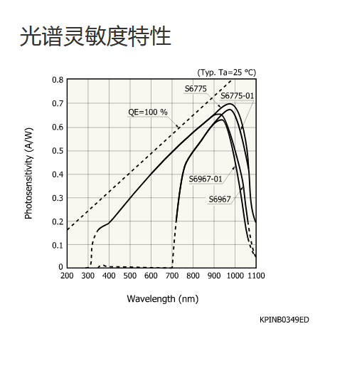 典型值 Ta=25°C,感光灵敏度:λ = 780 nm,暗电流:VR = 10 V,截止频率:VR = 10 V,结电容:VR = 10 V,f = 1 MHz,噪声等效功率:VR = 10 V,除非另有说明 |