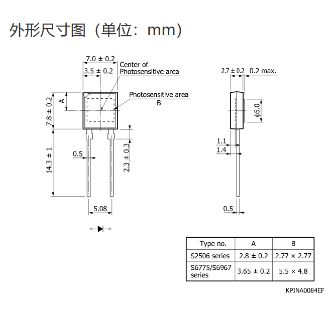 HAMAMATSU滨松 硅光电二极管 S6775 详细参数 受光面 5.5 × 4.8 mm 像素数 1 封装 塑料 散热 非冷却型 反向电压(最大值) 20 V 灵敏度波长范围 320 至 1100 nm 最大灵敏度波长(典型值) 960 nm 感光灵敏度(典型值) 0.55 A/W 暗电流(最大值) 10000 pA 截止频率(典型值) 15 MHz 结电容(典型值) 40 pF 噪声等效功率(典型值) 1.8×10-14 W/Hz1/2 测量条件 典型值 Ta=25°C,感光灵敏度:λ = 780 nm,暗电流:VR = 10 V,截止频率:VR = 10 V,结电容:VR = 10 V,f = 1 MHz,噪声等效功率:VR = 10 V,除非另有说明 0755 84689265 手机/微信:18320955412 QQ:2423332841 邮箱:2423332841@qq.com ...