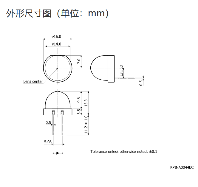 典型值 Ta=25°C,感光灵敏度:λ = 960 nm,暗电流:VR = 10 V,截止频率:VR = 10 V,结电容:VR = 10 V,f = 1 MHz,除非另有说明 |