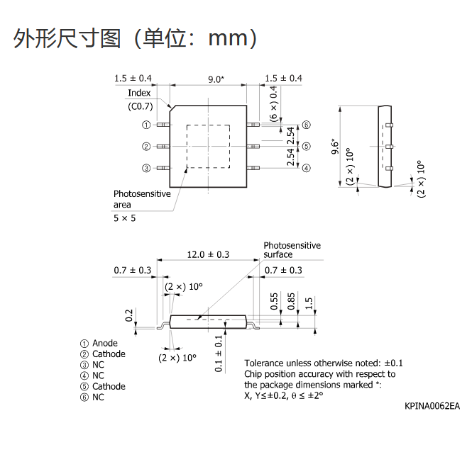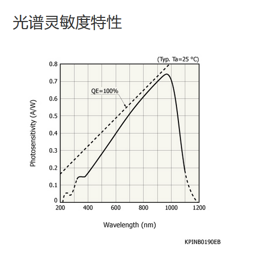 Ta = 25°C,典型值,感光灵敏度:λ = λp,暗电流:VR = 10 V,截止频率:VR = 10 V,结电容:VR = 10 V,f = 1 MHz,除非另有说明 |