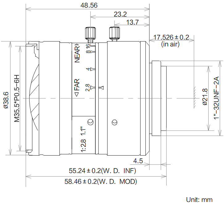 | 名称 | 16mm,F2.8,1.1",1200万分辨率,C接口镜头 | |