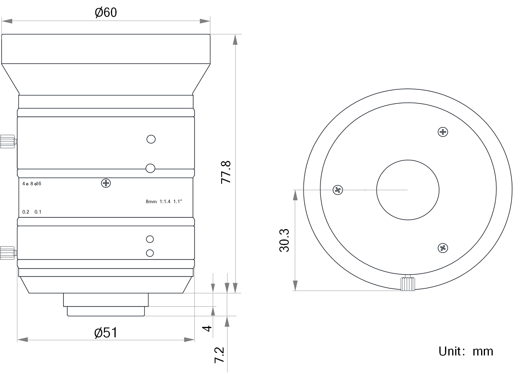 | 名称 | 8mm,F1.4,1.1",1200万分辨率,C接口镜头 | |