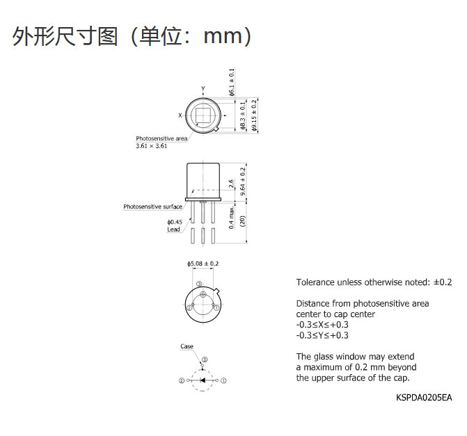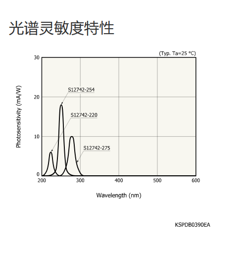 典型值 Ta=25°C,感光灵敏度:λ = 220 nm,暗电流:VR = 10 mV,结电容:VR = 0 V,f = 10 kHz,噪声等效功率:VR = 0 V,λ = λp,除非另有说明 |