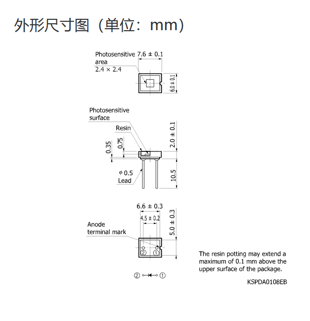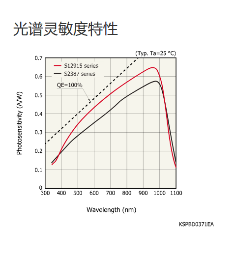 典型值 Ta=25°C,感光灵敏度:λ=λp,暗电流:VR=10 mV,上升时间:VR=0 V,f=10 kHz,分流电阻:VR=10 mV,噪声等效功率:VR=0 V,λ=λp,除非另有说明 |