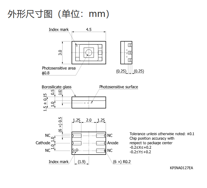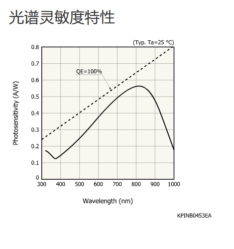 Ta = 25°C,典型值,感光灵敏度:λ = λp,暗电流:VR = 10 V,截止频率:VR = 10 V,RL = 50 Ω,λ = 830 nm,-3 dB,结电容:VR = 10 V,f = 1 MHz,噪声等效功率:VR = 10 V,λ = λp,除非另有说明 |