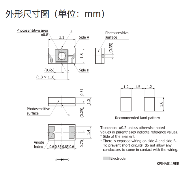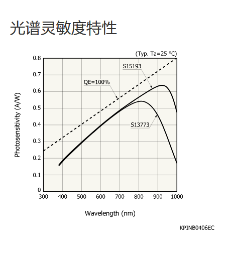 Ta = 25°C,典型值,感光灵敏度:λ = λp,暗电流:VR = 10 V,截止频率:VR = 10 V,RL = 50 Ω,-3 dB 结电容:λ = 830 nm VR = 10 V,f = 10 MHz,除非另有说明 |