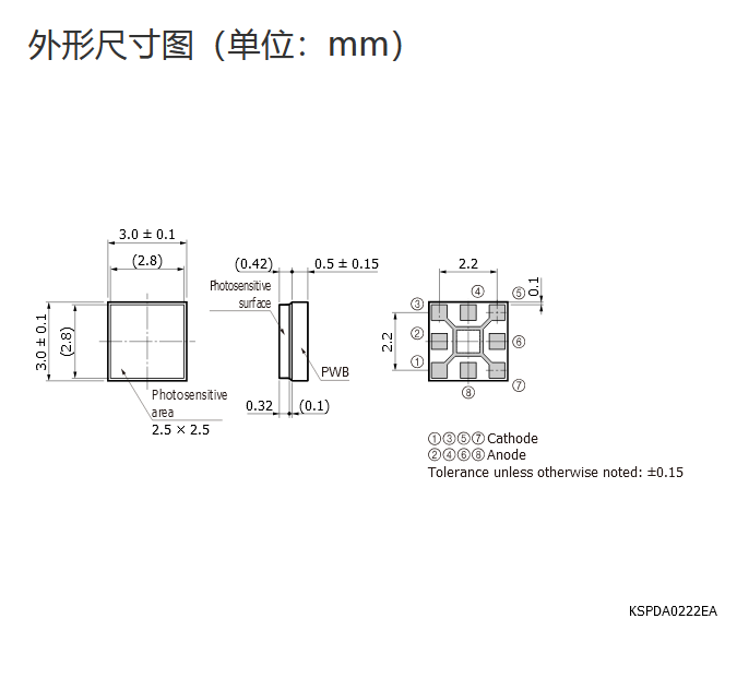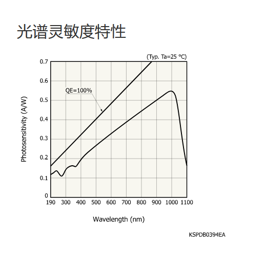 典型值 Ta=25°C,感光灵敏度:λ = 1000 nm,暗电流:VR = 10 mV,结电容:VR = 0 V,f = 10 kH,噪声等效功率:VR = 0 V,λ = λp,除非另有说明 |