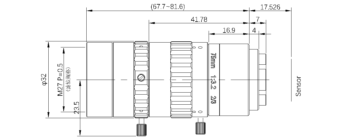 IRAYPLE 大华华睿 MH7532M 面阵镜头 基本参数 系列 MH-M系列 型号 MH7532M 镜头焦距 75 mm 光圈孔径 F3.2 - 16 像面尺寸 Ф11.4mm(2/3") 对焦范围 0.15 m to 0.5 m 光学畸变 <0.2% TV畸变 <0.1% 视场角 6.9° × 4.66° × 3.87° (11 mm × 8.5 mm × 7.1 mm,β=0.38x) 相对照度 85% (F3.2); 95% (F4.0) 主光线入射角 6.5° 光谱范围 436 nm~656 nm 光谱透过率 T>85% 净重 120 g 结构 安装接口 C口 滤镜接口 M27 × P0.5 对焦方式 手动调节 光圈控制 手动调节 产品尺寸 82.1 × Ф32 mm 环境 工作温度 -20°C~+50°C 手机/微信:18320955412 电话:86 0755 84689265 QQ:2423332841 邮箱:2423332841@qq.com...