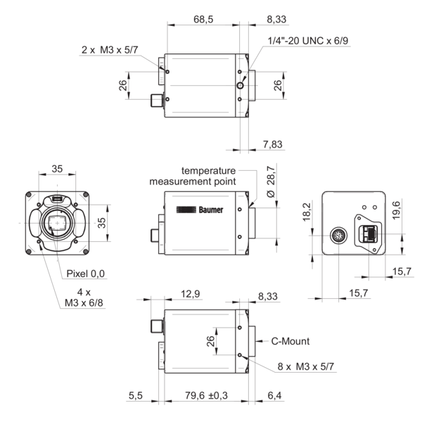 BAUMER 堡盟 VLXT-123M.FO 工业相机 传感器基本信息 传感器 Sony IMX253 Gen2 Mono/Color 黑白 传感器类型 1.1" CMOS 快门类型 全局快门 分辨率 4096 × 3000 px 像元尺寸 3.45 × 3.45 µm 曝光时间 0,001 … 60000 ms Dark noise 2,15 e- Saturation capacity 9145 e- Dynamic range 70,2 dB Signal-to-noise ratio 39,6 dB Quantum efficiency 65,2 % @ 536 nm 采集格式 图像格式,最高接口帧率 全帧,4096 × 3000 px,最高69 fps 像素合并 2×2,2048 × 1500 px,最高135 fps 像素合并 2×1,2048 × 3000 px,最高69 fps 像素合并 1×2,4096 × 1500 px,最高69 fps 图像格式,最高采集帧率(Burst模式) 全帧,4096 × 3000 px,最高69 fps 像素格式 Mono8 Mono10 Mono12 Mono12 Packed 图像预处理 模拟量控制 增益 (0…48 dB) 偏移 (0…255 LSB 12位) 彩色型号 黑白 相机功能 Basic F...