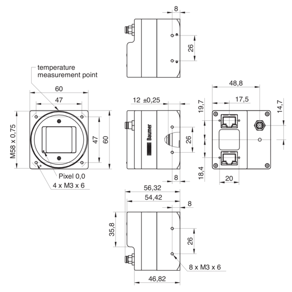 BAUMER 堡盟 LXG-80M 工业相机 传感器基本信息 传感器 ams (CMOSIS) CMV8000 Mono/Color 黑白 传感器类型 4/3" CMOS 快门类型 全局快门 分辨率 3360 × 2496 px 像元尺寸 5.5 × 5.5 µm 曝光时间 0,04 … 1000 ms Dark noise 12,07 e- Saturation capacity 9614 e- Dynamic range 57,7 dB Signal-to-noise ratio 39,8 dB Quantum efficiency 41,7 % @ 536 nm 采集格式 图像格式,最高接口帧率 全帧,3360 × 2496 px,最高29 fps 像素合并 2×2,1680 × 1248 px,最高29 fps 像素合并 1×2,3360 × 1248 px,最高29 fps 像素合并 2×1,1680 × 2496 px,最高29 fps 图像格式,最高采集帧率(Burst模式) 全帧,3360 × 2496 px,最高61 fps 像素格式 Mono8 Mono12 Mono12 Packed 图像预处理 模拟量控制 增益 (0…12 dB) 偏移 (0…255 LSB 12位) 彩色型号 黑白 相机功能 同步 自由运行 触发 触发电平...