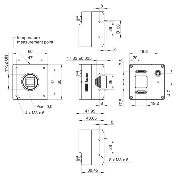 BAUMER 堡盟 LXC-20M 工业相机 传感器基本信息 传感器 ams (CMOSIS) CMV2000 V3 Mono/Color 黑白 传感器类型 2/3" CMOS 快门类型 全局快门 分辨率 2048 × 1088 px 像元尺寸 5.5 × 5.5 µm 曝光时间 0,03 … 1000 ms Dark noise 16,11 e- Saturation capacity 9058 e- Dynamic range 54,6 dB Signal-to-noise ratio 39,6 dB Quantum efficiency 51,2 % @ 536 nm 采集格式 图像格式,最高接口帧率 全帧,2048 × 1088 px,最高337 fps 像素合并 2×2,1024 × 544 px,最高337 fps 像素合并 1×2,2048 × 544 px,最高337 fps 像素合并 2×1,1024 × 1088 px,最高337 fps 像素格式 Mono8 Mono10 图像预处理 模拟量控制 增益 (0…12 dB) 偏移 (0…63 LSB 10位) 彩色型号 黑白 颜色处理 NA 相机功能 同步 自由运行 触发 触发电平 硬件 软件 触发延迟 0…2秒,跟踪缓冲多达512个触发信号 定序器 使用不同...